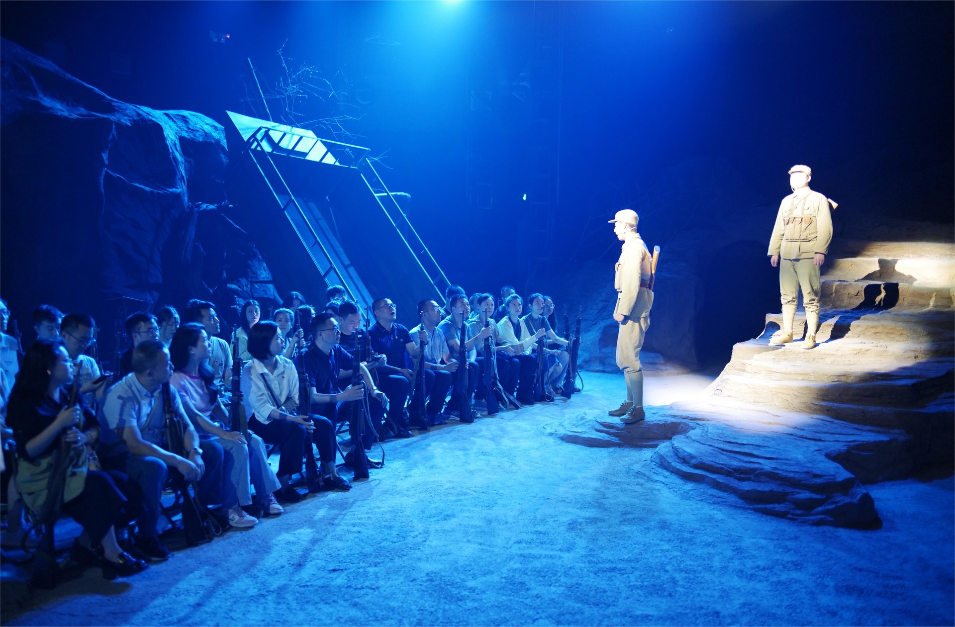 “同志們,你們準(zhǔn)備好了嗎?”“準(zhǔn)備好啦!”參觀完紅色文化長(zhǎng)廊,大家整齊列隊(duì)進(jìn)入沉浸式劇場(chǎng),在充滿歷史感的環(huán)境中,駐足2024、回望1953。通過家鄉(xiāng)話別、寫家書、投擲手榴彈、坑道作戰(zhàn)、運(yùn)送物資等環(huán)節(jié)沉浸式體驗(yàn)硝煙彌漫的戰(zhàn)場(chǎng),先輩們的英勇事跡在全息影像中得以生動(dòng)還原,每一幀畫面都如同英雄的心跳,激發(fā)著黨員干部?jī)?nèi)心的無尚崇敬和愛國(guó)主義情懷。在虛擬與現(xiàn)實(shí)交融的舞臺(tái)上,大家觸摸歷史的脈搏,集體莊重許下弘揚(yáng)偉大抗美援朝精神建設(shè)四川水網(wǎng)的莊嚴(yán)承諾。